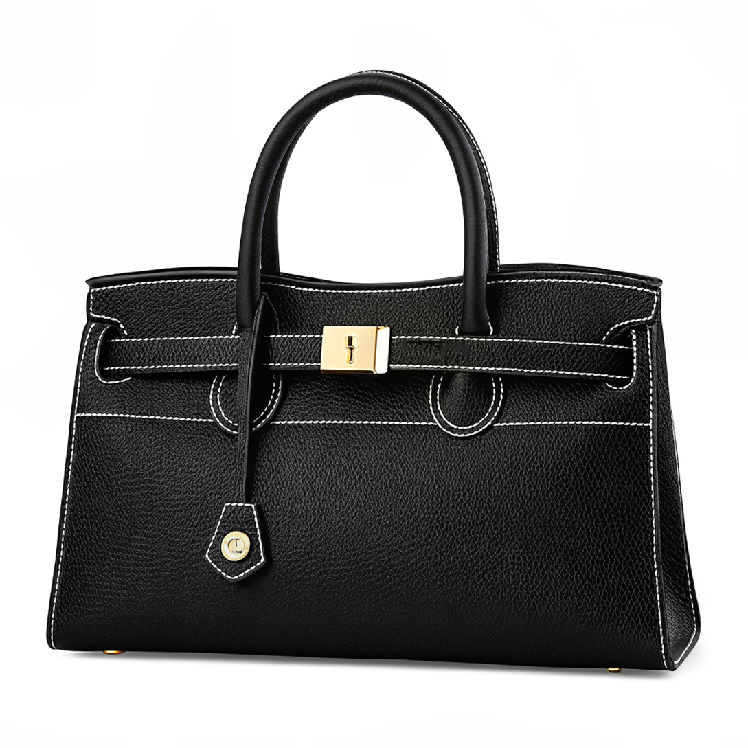 The BrillianceBling black grained leather tote bag is crafted from premium textured cowhide, offering both durability and a refined touch. Featuring shiny light gold-colored hardware and a secure magnetic closure, this bag embodies understated elegance with a modern edge. Four protective bottom feet enhance stability and durability, ensuring lasting quality.